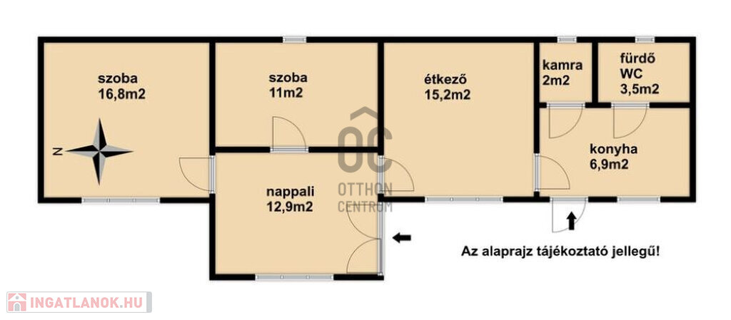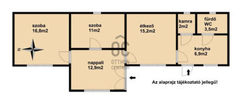 - 2 hálószoba, nappali, étkező, konyha, fürdőszoba-wc-vel, kamra helyiségekből áll a lakótér.