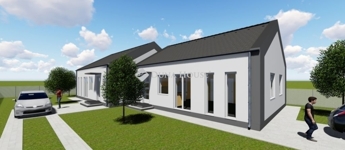Műszaki tartalombeton alap, Ytong falazat, 10 cm homlokzati szigetelés, 30 cm födémszigetelés, szeglemezes tetőszerkezet, cserép fedés