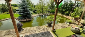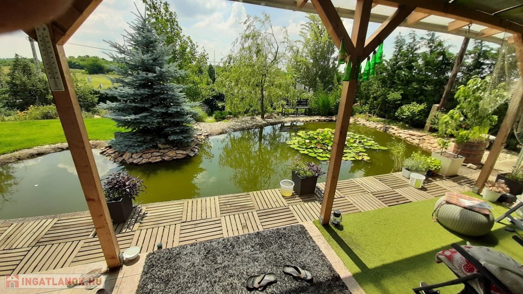 Kert: Örökzöld sövény, díszfák és egy hangulatos kerti tó díszhalakkal.