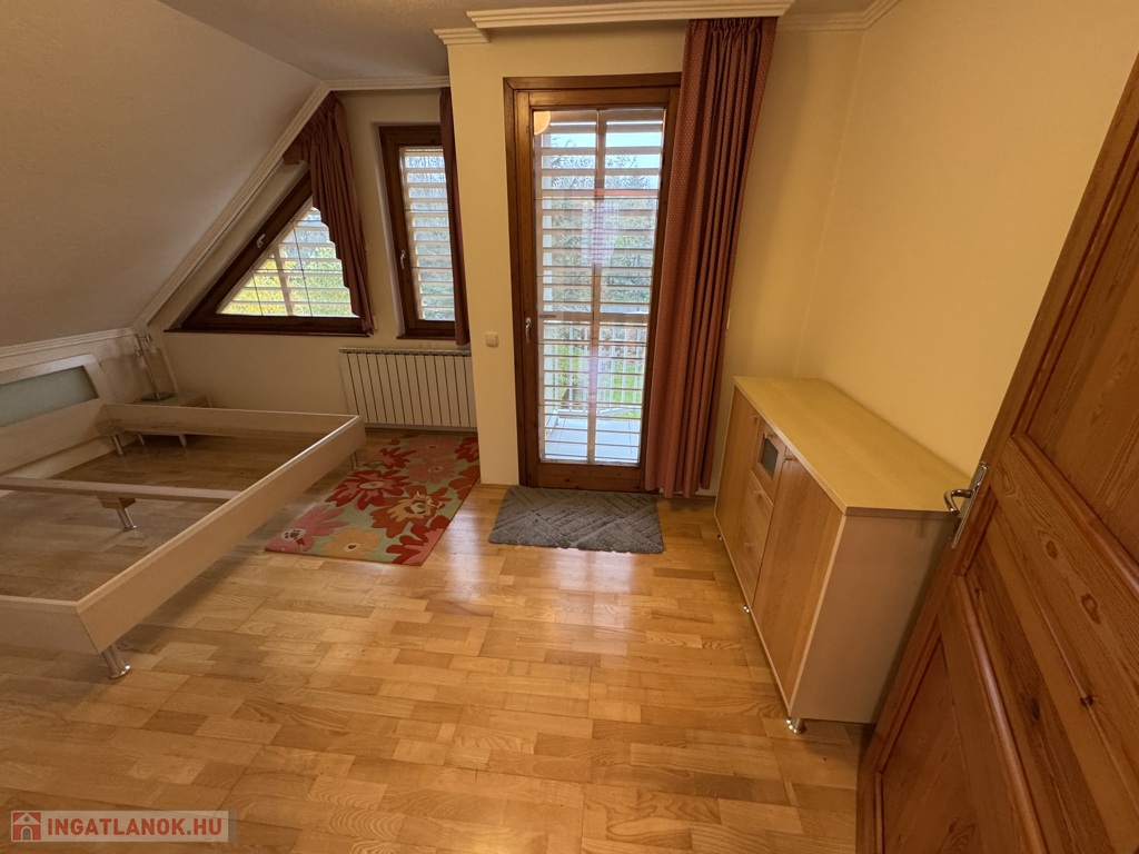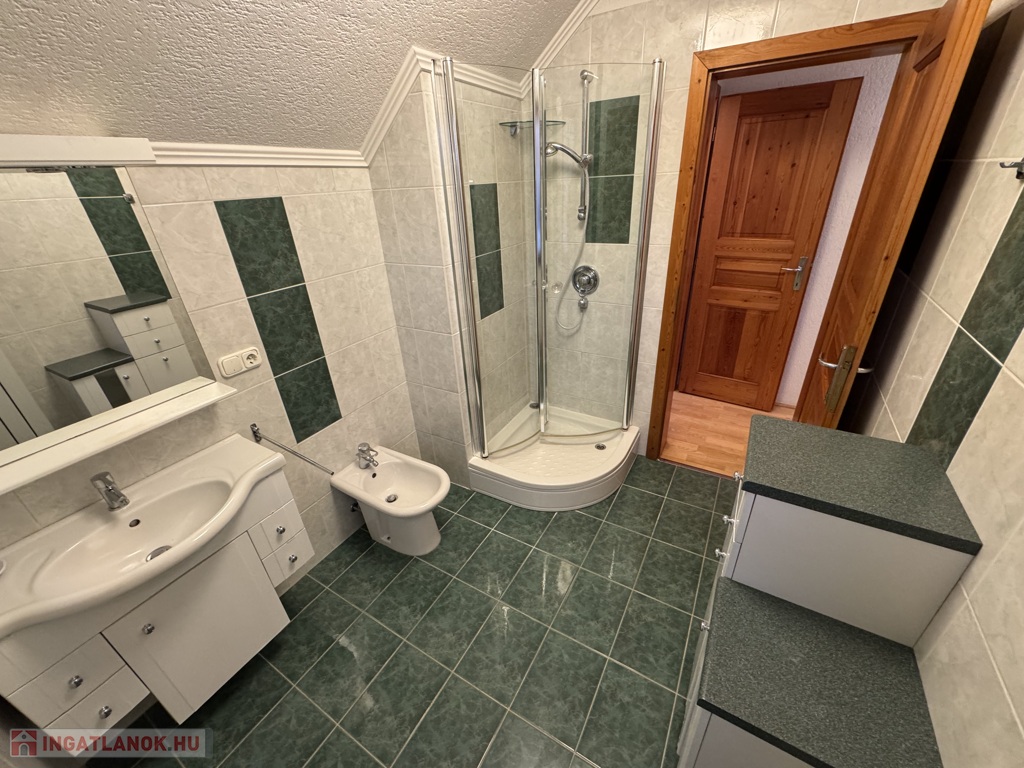 emelet: közlekedő, 2 db hálószoba, fürdőszoba, wc, padlástér, erkély, lakótér összesen:55 m2.