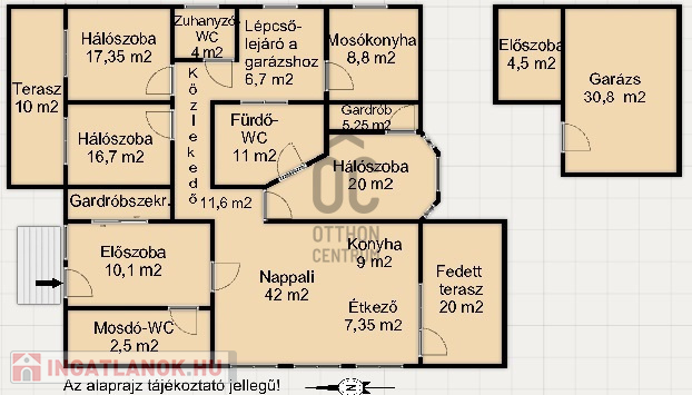 - a földszint + pinceszint helyiségei: 3 hálószoba, nappali, konyha, étkező- terasz kapcsolattal, előszoba, közlekedő, gardrób, mosókonyha, 2 fürdő-WC-vel, 1 WC, lépcsőfeljáró, garázs stb.