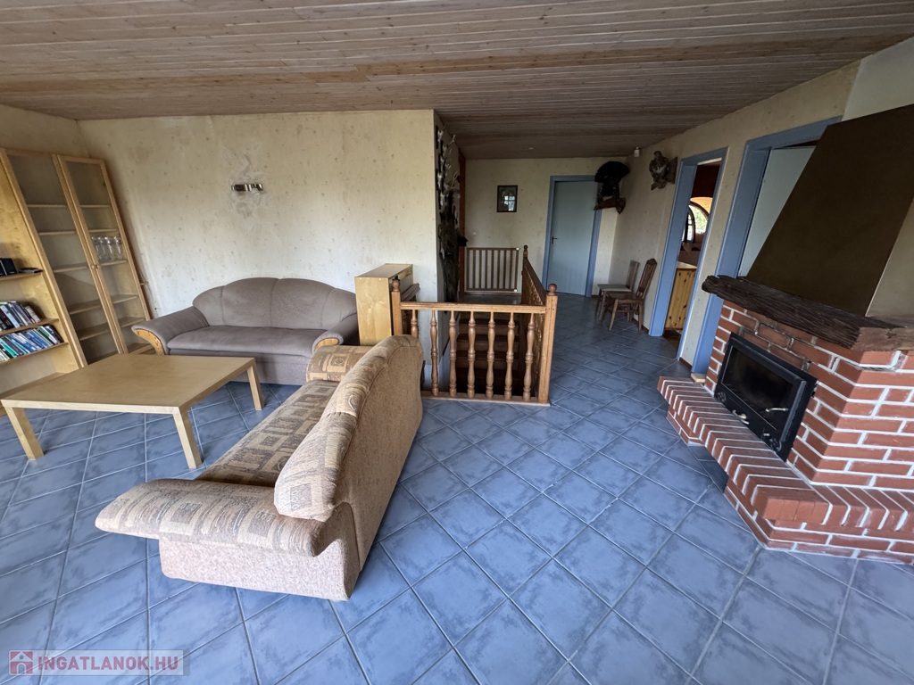 •30 m²-es nappali beépített fatüzeléses kandallóval,