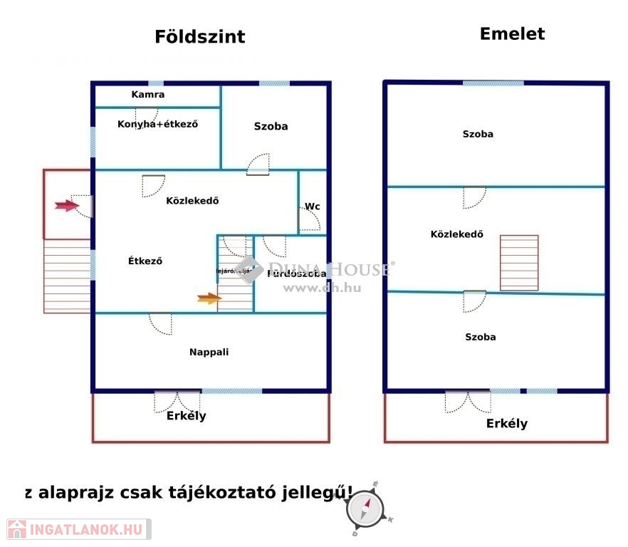 A bejárati ajtón beérve a földszinti részen: egy tágas előtér étkező kialakítás, konyha, kamra, tágas 22 m2-es nappali, külön WC, fürdő zuhanyzóval felszerelve, 1 szoba kialakítás. A tetőtérben 2 tágas szoba és egy előtér került kialakításra.