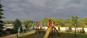 1014 m²-es, gondozott udvar, amely részben térkövezett, részben parkosított, díszfákkal beültetett.