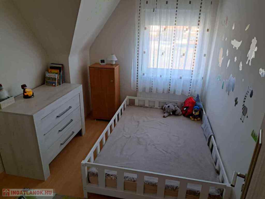 Alsó szinten: nappali, szoba, sarokkádas fürdőszoba, wc, kamra, lépcső alatti tároló, konyhaFelső szinten: nappali-dolgozó, 2 szoba, gardrób, zuhanyzós fürdőszoba +wc