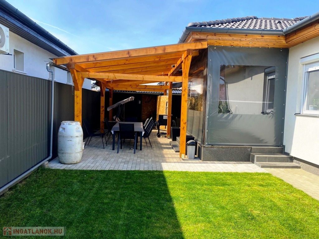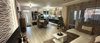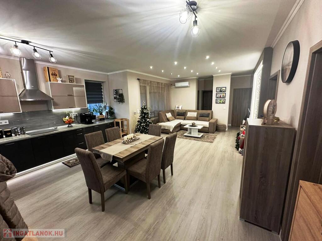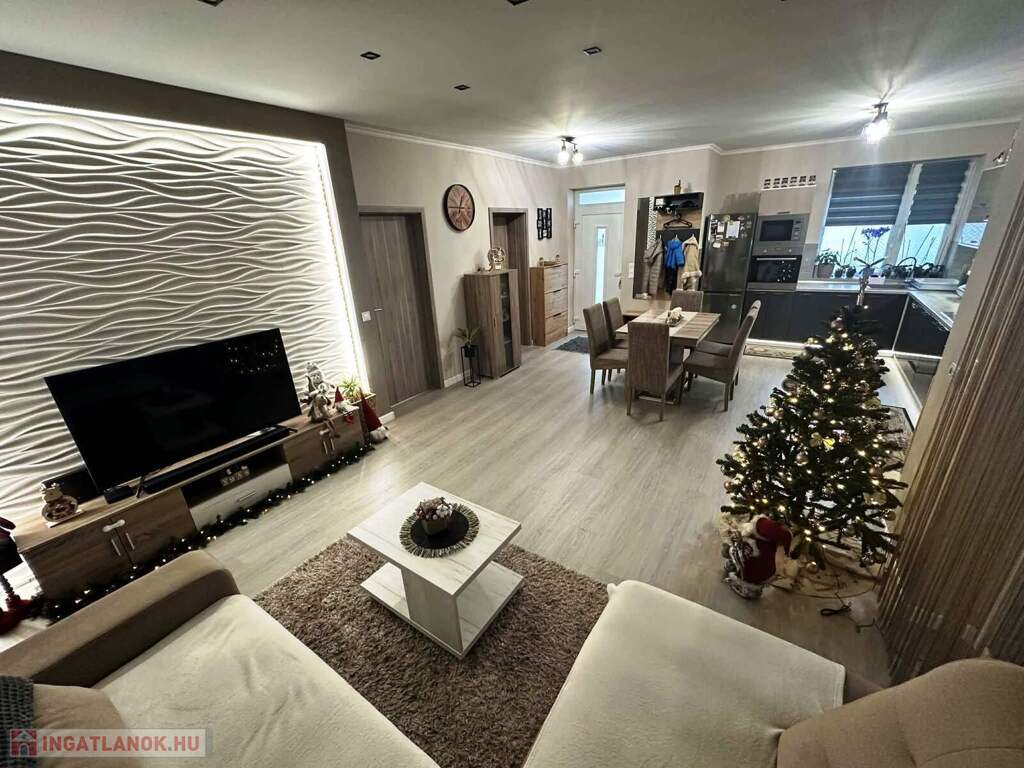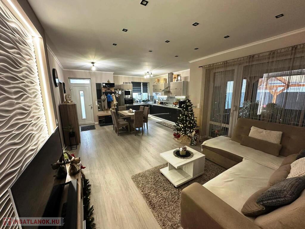 Nyíregyháza Ságvári kertvárosának új lakónegyedében, csendes, aszfaltozott utcában eladó egy 2019-ben épült, 3 szobás, amerikai konyhás-nappalis ikerház, dupla garázzsal, 450 m²-es parkosított telken.