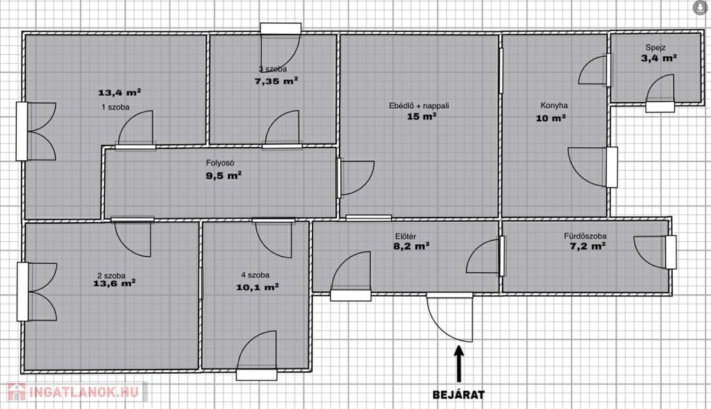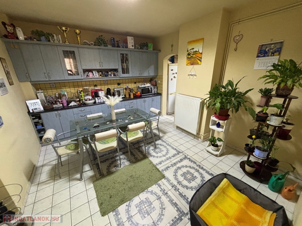 Az ingatlan 1145 m2, 2/3 részben körbekerített telken fekszik, összközművel rendelkezik. Teljes egészében tégla építésű, átfogó korszerűsítésen 2013-ban esett át, ezt követte a folyamatos felújítás és állagmegóvás, állapota nem luxus, inkább átlagos. A 100 m2 alapterületből van 3,5 szoba, mely ideális több generáció együttélésére, szeparáltságot biztosít, tágas központi helyisége mégis lehetővé teszi a család, vagy barátok minőségi együttlétét.
