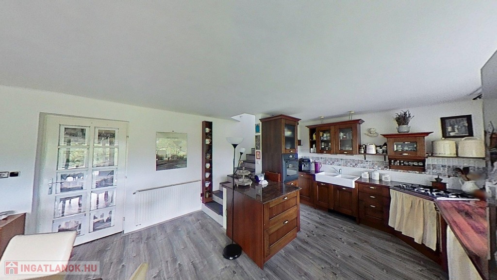 Itt, Bánoson található ez a 2016-ban teljeskörűen felújított ház, egy 1200 nm-es sík telken. Igény esetén a telek akár 4200nm-re is bővíthető. A kétszintes ház földszintjén nagy nappali, konyha, háló- és egy ebből nyíló fürdőszoba, egy külön wc és előszoba osztozik. A konyha bár egy légtér a nappalival, mégis jól elszeparált a nappali életterétől. A nappalinak van egy kisebb, hangulatos része, amit akár le is lehet választani egy gardróbnak, gyermekszobának, stb., bár kár lenne érte, mert jelenleg nagyon jó olvasó/dolgozósarokként működik.