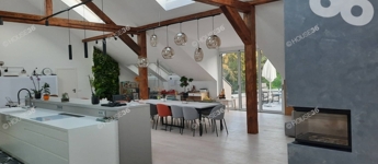 A rendkívül robosztus födém acél szerkezettel való megerősítését követően kialakításra került egy impozáns, első emeleten elhelyezkedő tágas luxus lakrész. Az elrendezés meghatározó központi elemét képezi a 130 négyzetméteres, legmagasabb pontján 7,5 méter belmagassággal rendelkező nappali. A helyiségbe belépve azonnal szembe ötlik a részben látszó gerendás tetőszerkezet és a központi helyet elfoglaló étkező asztal. Szemközt bal oldalon 30 négyzetméteres játszó sarok, vele átellenben felnőtteknek felhőtlen szórakozásra kialakított terület található.