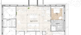 A földszinten újabb, közel 300 négyzetméternyi, jelenleg felújítás elejénél helyiségek tér tárulnak elénk.