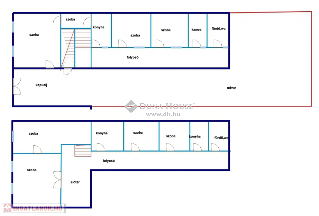Jelenleg 4 lakásos 9 szobával közös udvarral, pincével, padlással.