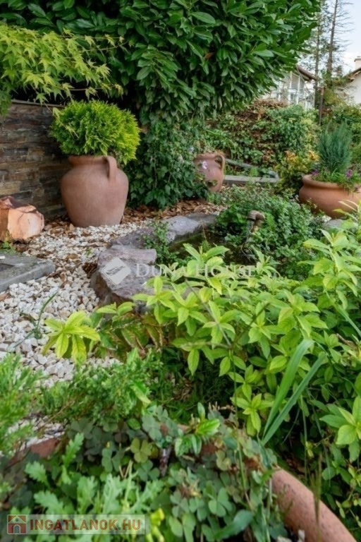 Ezenkívül egy külön 55 m²-es lakást, egy 2 beállásos garázst, tárolókat, valamint egy több mint 100 m²-es, természetes kőburkolatú terasszal, pergolával ,parkosított kerttel, halas tóval .