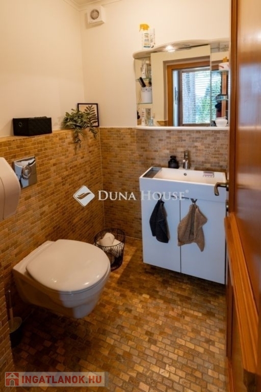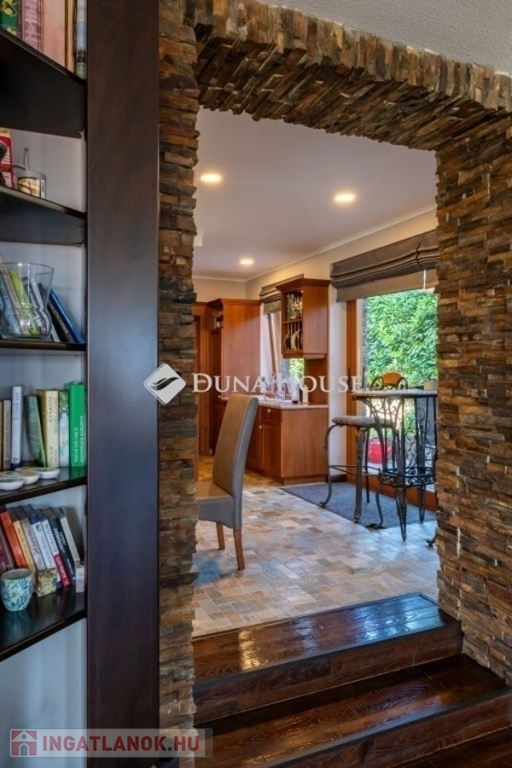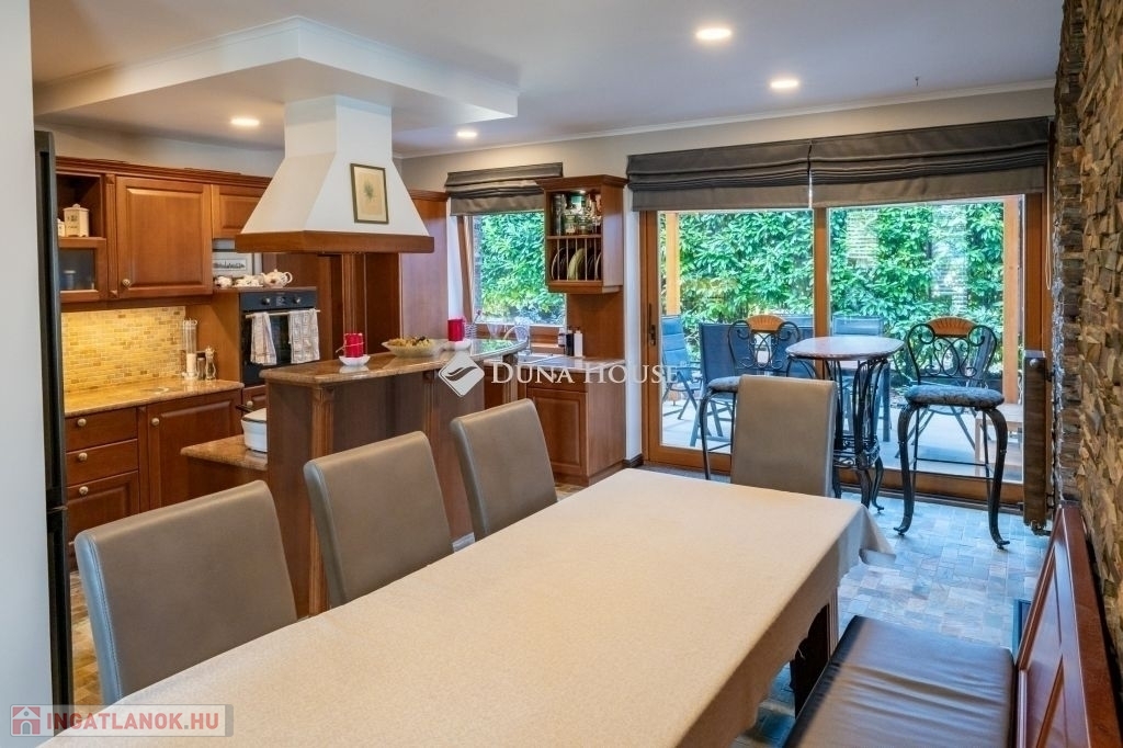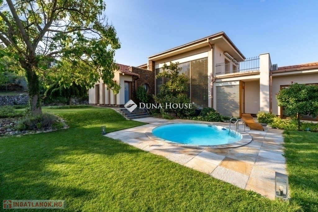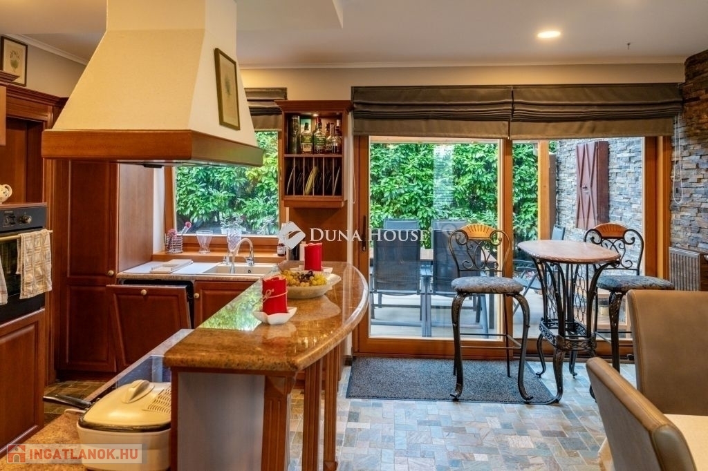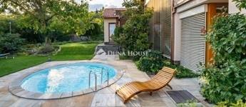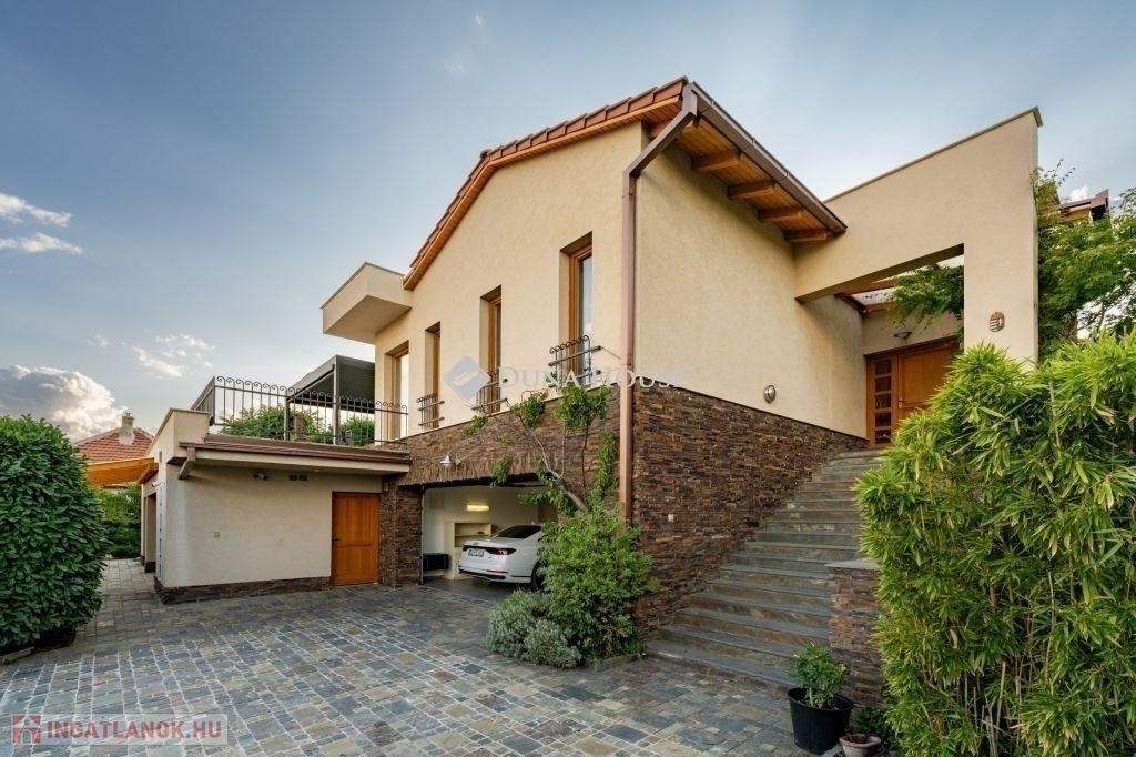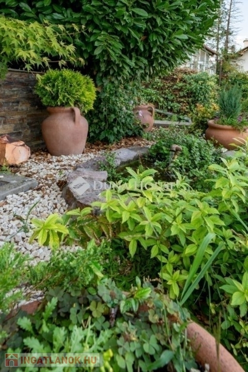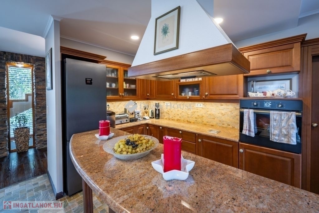 A házhoz tartozik egy kétállásos garázs, több tárolóhelyiség, valamint egy több mint 100 m²-es, természetes kőburkolatú terasz pergolával. A parkosított kertben halas tó és medence is helyet kapott, a gondosan megtervezett környezet pedig nyugalmat és harmóniát áraszt.
