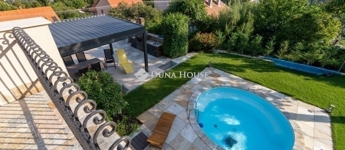 Eladó egy ritka gyöngyszem ingatlan, mely 2000 m2-es telken lévő családi otthon, 380 m² összterülettel büszkélkedhet, ideértve a fő lakóteret, amely 5 hálószobával , rendelkezik . Ezenkívül egy külön 55 m²-es lakást, egy 2 beállásos garázst, tárolókat, valamint egy több mint 100 m²-es, természetes kőburkolatú terasszal, pergolával ,parkosított kerttel, halas tóval .Legyen szó akár nagyobb családokról, akár olyanokról, akik szeretik a vendégeiket luxus körülmények között fogadni, ez az ingatlan tökéletes választás lehet. Az elszeparált lakrész lehetőséget nyújt vendégek kényelmes elszállásolására vagy akár egy nagyobb korú gyermek önálló életterének kialakítására is.Az ingatlan nem csupán a luxus szolgáltatásaival, hanem esztétikai értékeivel is kiemelkedik. A magas minőségű anyagok felhasználása és a részletekre való odafigyelés egy olyan otthont teremt, amely minden igényt kielégít. A panorámás kilátás pedig még inkább emeli az ingatlan értékét, hiszen minden napja egy festménybe illő látvánnyal kezdődhet.A kényelem és a luxus jegyében épült ingatlanban minden megtalálható, amire csak vágyhat: egy gyönyörűen kialakított medence, szauna, pezsgőfürdő, hangulatos teraszok, és természetesen a téli estéket kellemessé tevő kandalló. A napfényes terek gondoskodnak arról, hogy otthona mindig világos és meleg legyen, míg a modern klímaberendezés a nyári napokat is kellemessé teszi.Összefoglalva, ez az ingatlan nem csupán egy lakóhely, hanem egy olyan befektetés, amely értékálló marad a jövőben is. Ha Ön egy olyan otthont keres, ahol a luxus, a kényelem és a lélegzetelállító kilátás mindennapos, ne keressen tovább. Fedezze fel, mit kínál ez a különleges ingatlan és tegyen egy lépést álmai otthona felé.