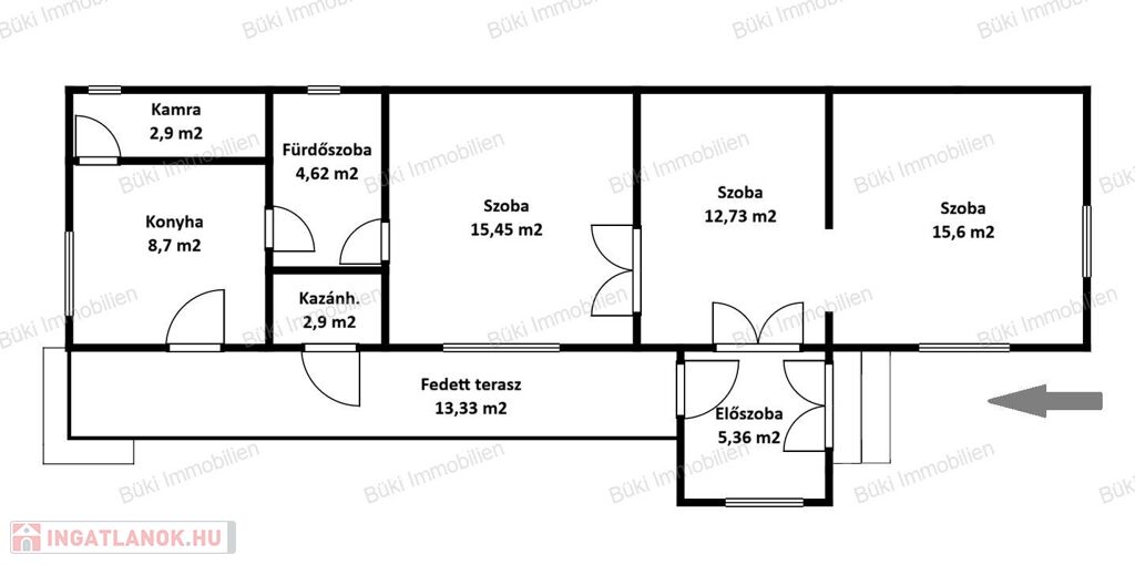 A két irányból megközelíthető előtérből belépve három kedves, jól használható szoba fogadja az embert, a terek világosak, a tájolásnak köszönhetően szinte egész nap természetes fény járja át az otthont. A fürdőszoba két irányból is megközelíthető, ami a mindennapi használat során kifejezetten praktikus megoldás. A konyha barátságos hangulatú ös möretöbül adódóan az étkező is helyet kapott benne. A konyha mellett egy kamra is kialakításra került, így a tárolás is kényelmesen megoldható. Ezen felül külső tároló is rendelkezésre áll.