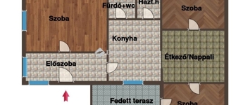 KIALAKÍTÁSA: 3 szoba ( tágas utcafronti szoba: 14.82 m2 ), konyha, étkező, fürdő+wc, háztartási helyiség, 2 szoba, étkező, fedett terasz.