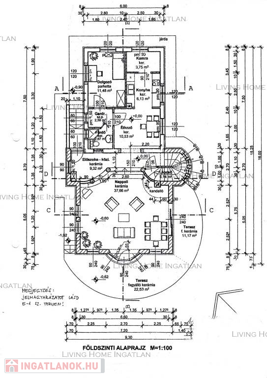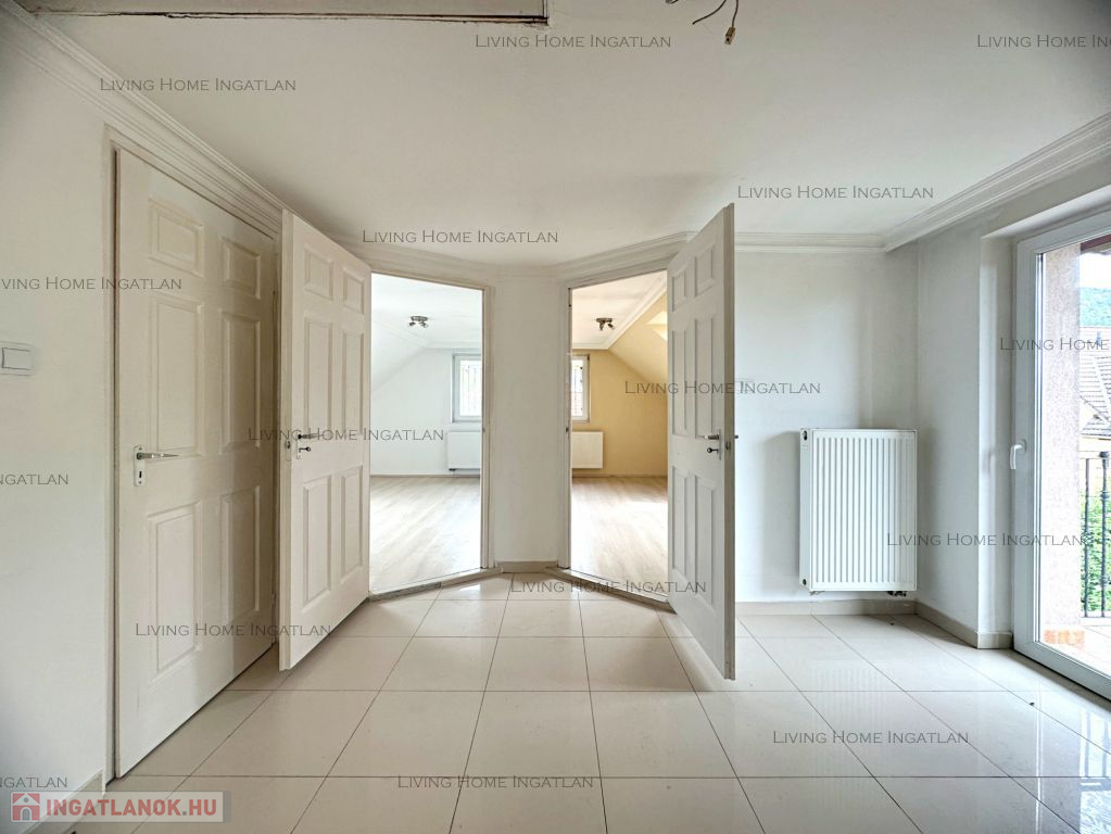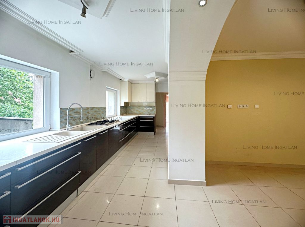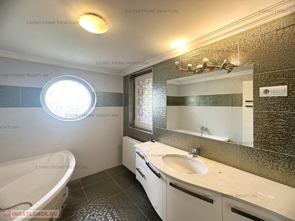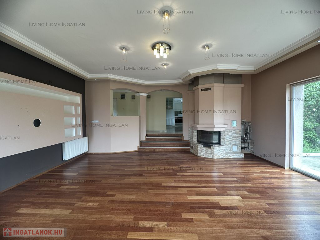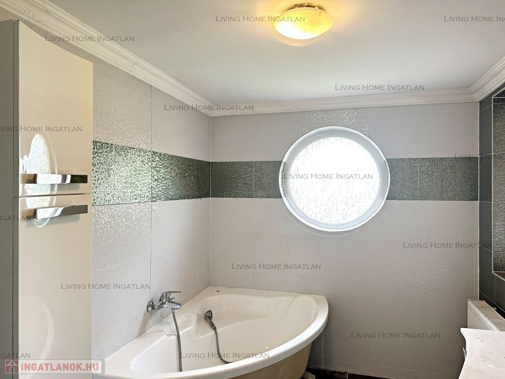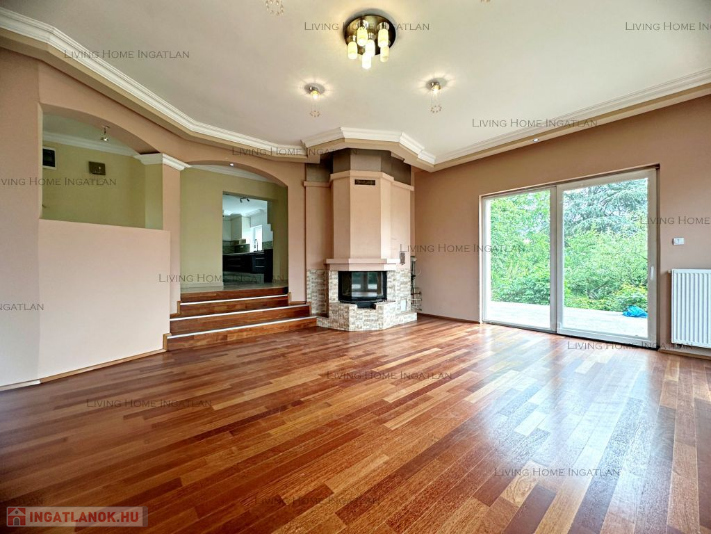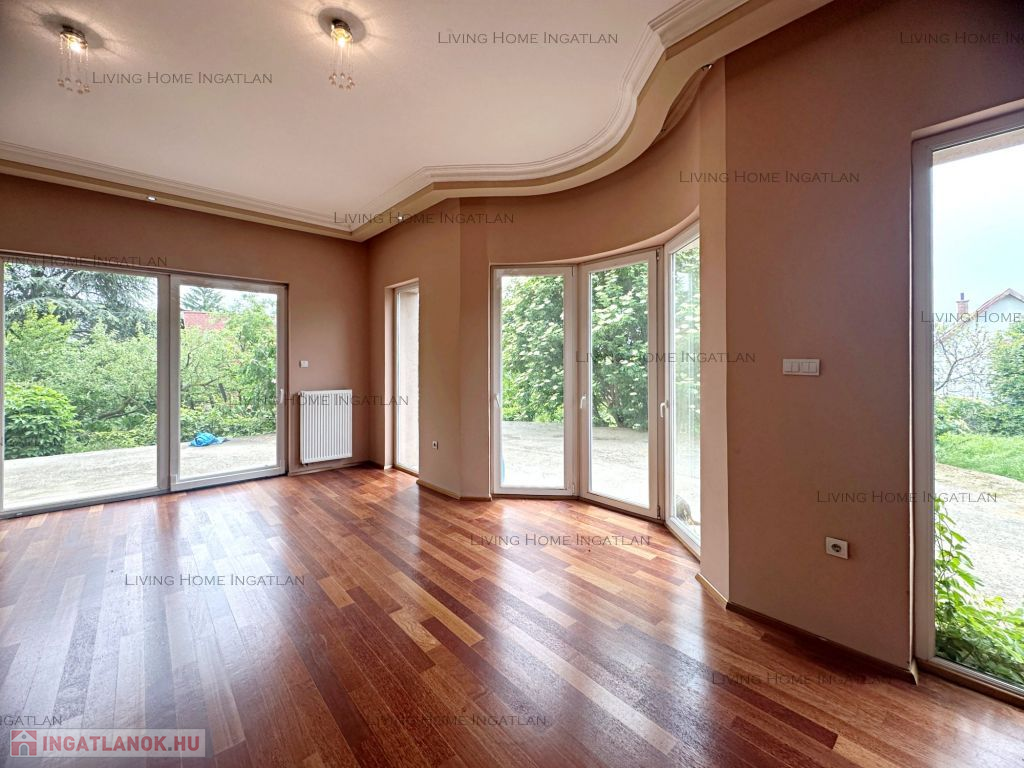 Földszint: A közel 40 nm-es, félkörívben üvegezett, hangulatos nappali szervesen kapcsolódik a nagy hátsó, intim teraszhoz. A minőségi, új parketta, a néhány lépcsős szinteltolás és a médiafal kialakítása modern, egységes hangulatot teremt.