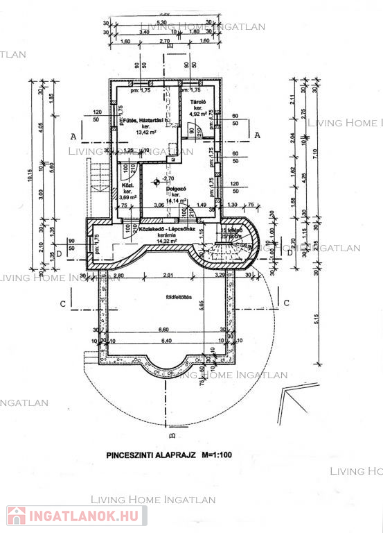 Alagsor: Gépészeti helyiség, kazánház, tárolók, szuterénes szoba.