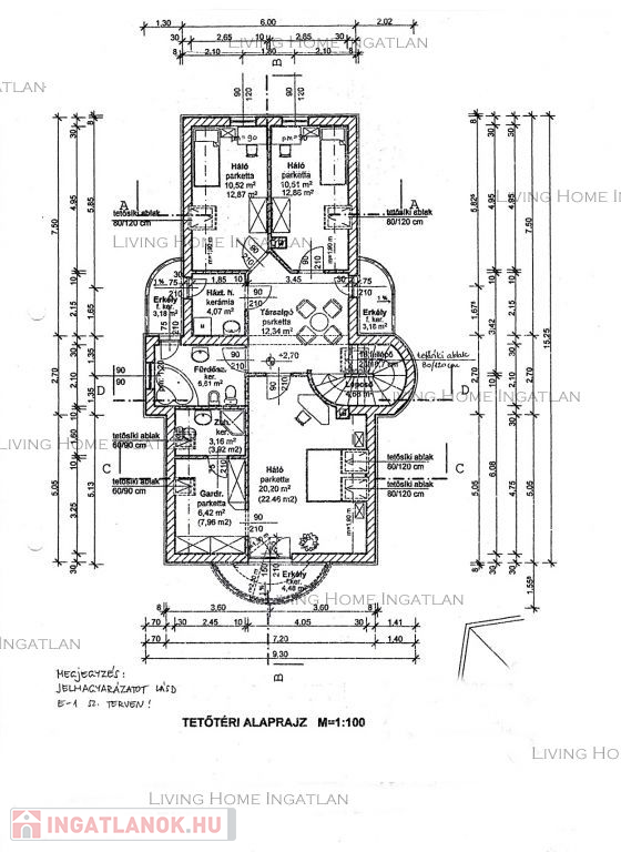 Emelet: A lépcsőn felérve egy kisebb, erkélykapcsolatos nappaliba érkezünk, innen nyílnak csillag szerűen a szobák. Található még itt két fürdőszoba, mosókonyha és egy szárító helyiség is.