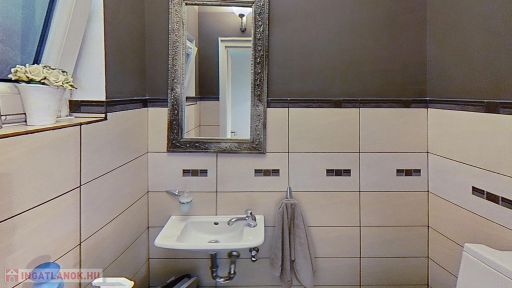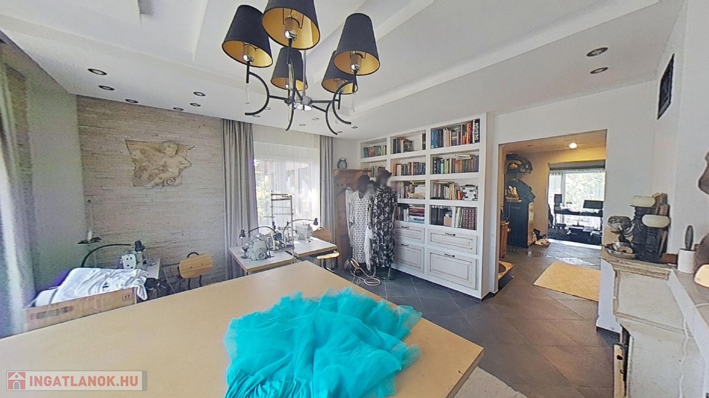 A földszinten egy gyönyörű, 70 nm-es nappali/étkező lehet a családi élet központja, mely hatalmas ablakokkal és a medence/kert felé nyíló nagy teraszajtóval bír, így a nap minden időszakában világos. Az étkező egy légtér a nappalival, de bútorral, valamint egy egy lépcsőnyi szinttel mégis jól elkülönül attól. A földszinten van még két nagy méretű háló (melyből egyik jelenleg a home office, itt szintén működő kandallót találunk), egy fürdő/wc, valamint egy külön wc.