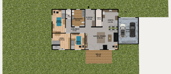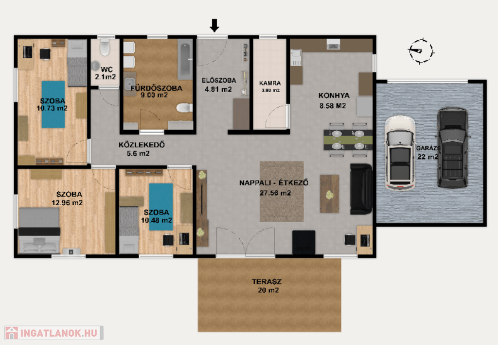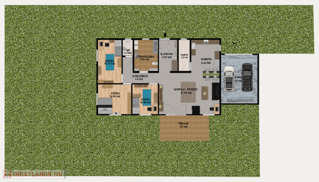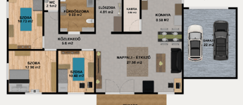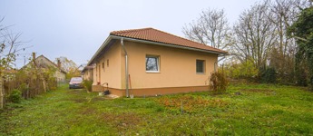 A 736 m²-es telken elhelyezkedő ingatlanban 3 hálószoba, amerikai konyhás nappali, fürdőszoba, vendégmosdó és egy spejz kapott helyet.