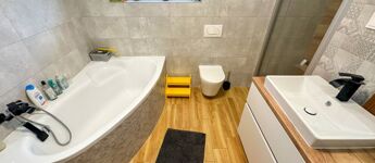 - Fürdőszoba: modern kialakítású, teljesen felszerelt, sarokkáddal és zuhanyzóval (Ravak).