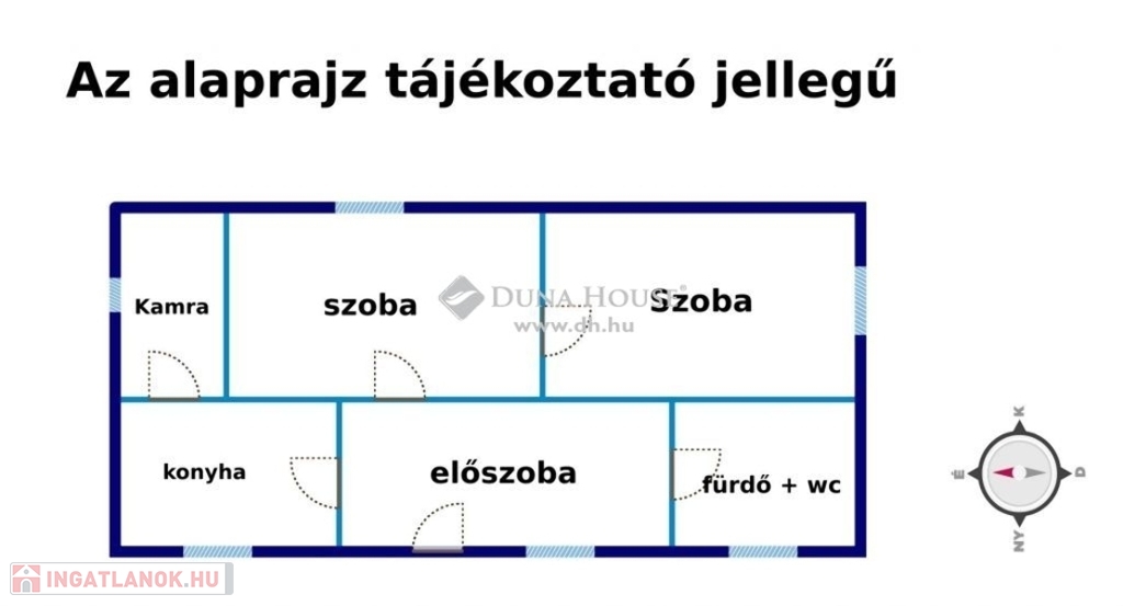 Elrendezés: A házba belépve egy tágas előszoba fogad, innen nyílik a konyha étkezővel és kamrával, valamint a folyosó másik végén található a tusolós fürdőszoba.