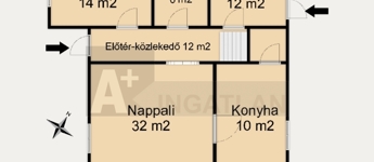 Földszint: konyha, nappali + 1 szoba, kádas fürdőszoba wc-vel, kazánház