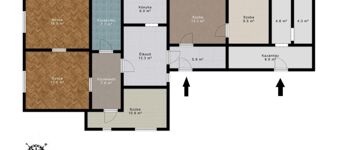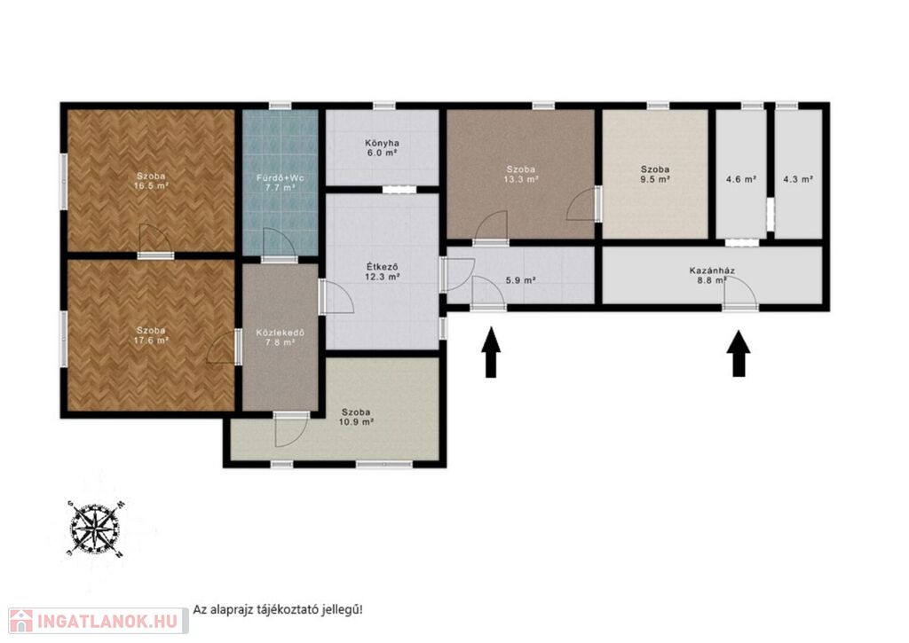 Hasznos alapterülete 138 m², amely a következő helyiségekből áll: 3+2 szoba, folyosó, konyha (felújított konyhabútorral), külön étkező, fürdőszoba WC-vel, kazánház, kamra, tároló.