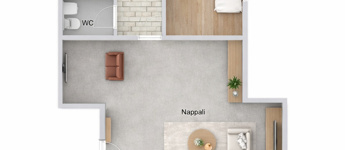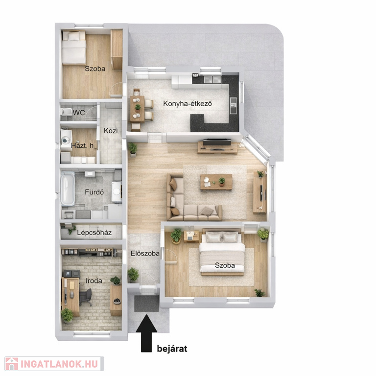 A földszinten tágas, egybenyitott nappali–étkező–konyha fogadja, mellette két hálószoba, külön fürdőszoba és WC. A fedett előtérből nyíló, jelenleg irodaként használt helyiség könnyedén átalakítható garázzsá vagy további szobává, de vállalkozási célokra is ideális.