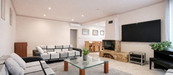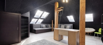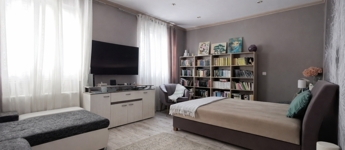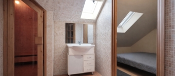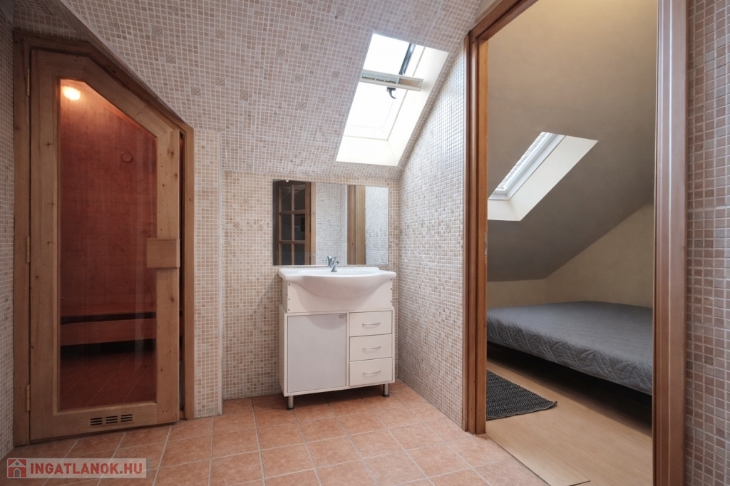 Az emeleten további tágas nappali (jelenleg klubszoba és konditerem), egy hálószoba, fürdőszoba és szauna kapott helyet, így a ház tökéletes a teljes kikapcsolódáshoz, akár két generáció számára is.