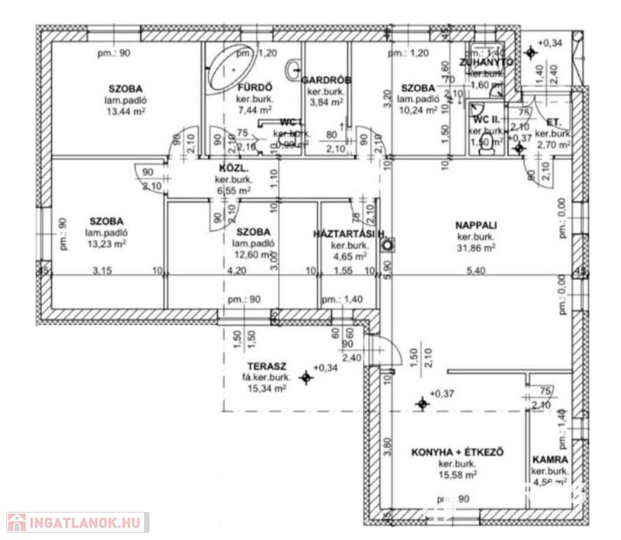 - konyha + nappali + 4 hálószoba + 2 fürdő + 2 kükön wc