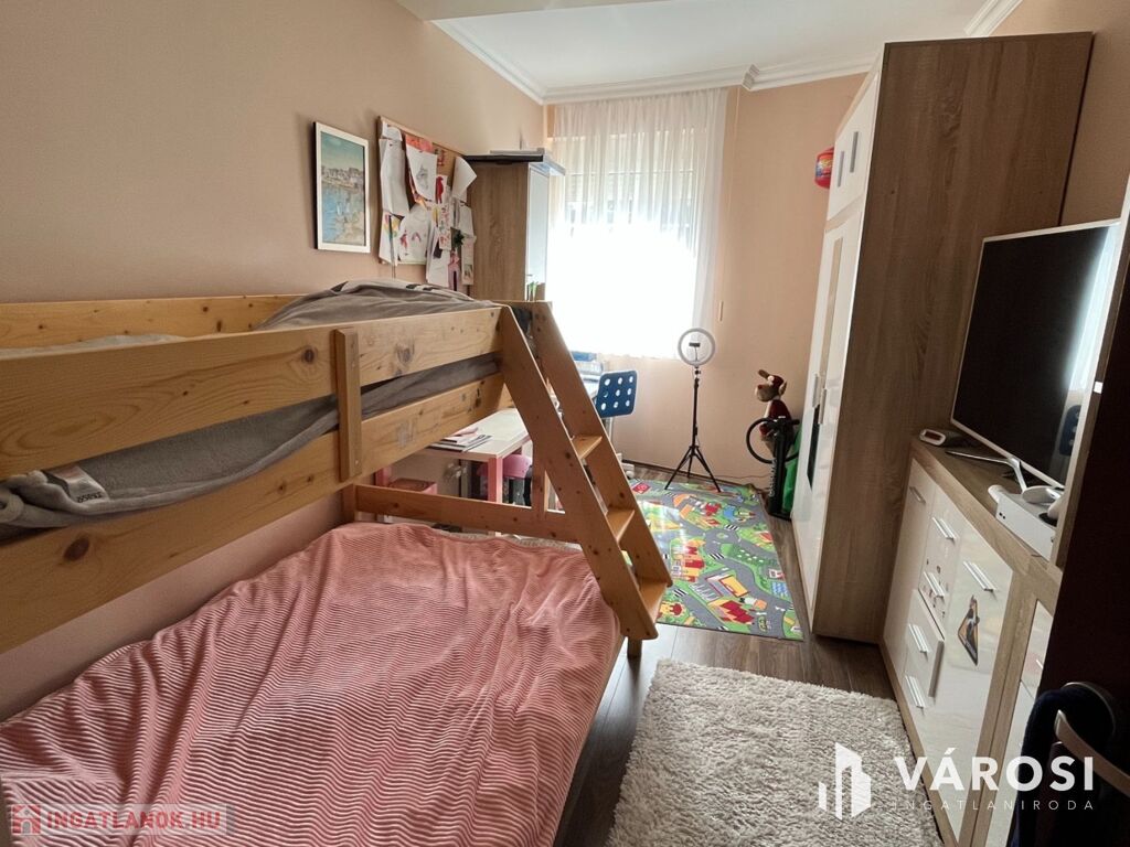 - Alsó szint: 80 m2-es lakás, amely nappali-étkező-konyhából, 2 hálószobából, fürdőszobából és külön WC-ből áll.