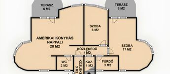 - Felső szint: 2 db 40 m2-es, külön bejáratú apartman, mindkettőben nappali-étkező-konyha, 1 hálószoba és fürdőszoba WC-vel.
