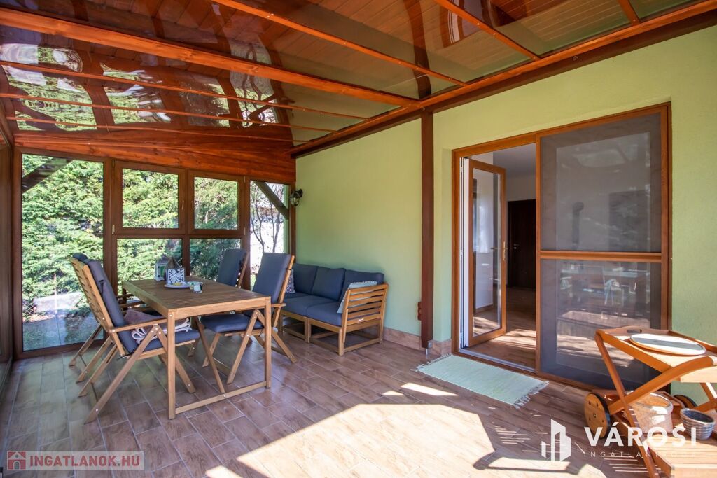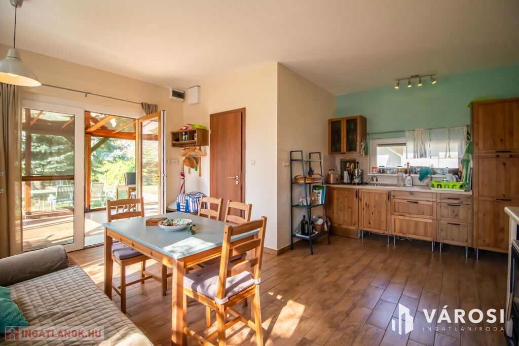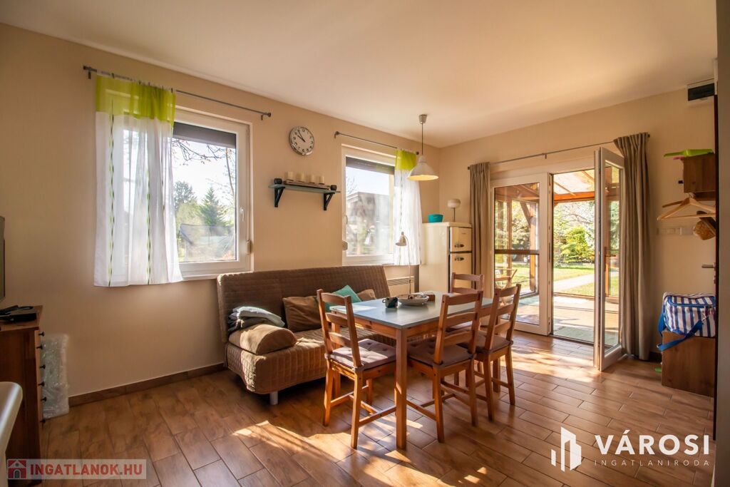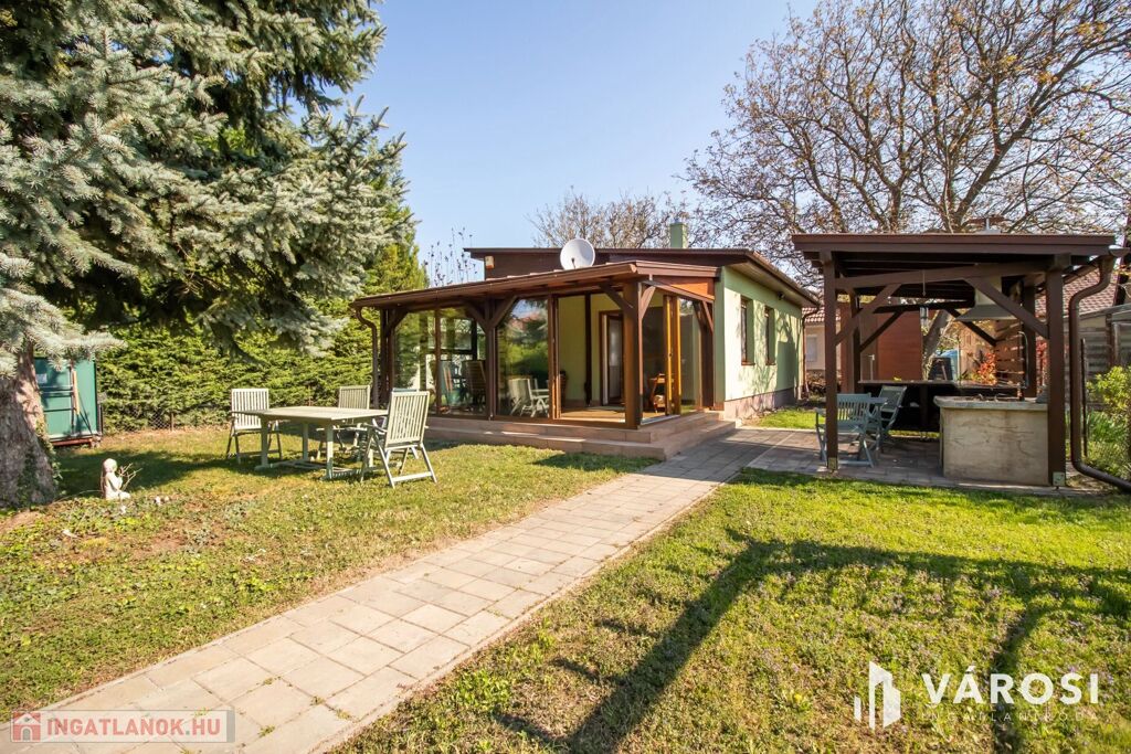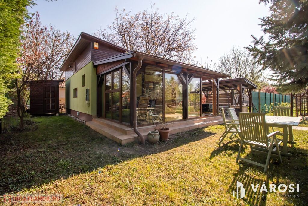 Az 577 négyzetméteres telken épült, 62 négyzetméteres tégla falazatú házban amerikai konyhás nappali étkezővel, 2 szoba és fürdőszoba található. A ház előtti terasz be lett építve, 3 rétegű üvegezéssel ellátott oldalfalakkal és hatalmas tolóajtóval. Ezeket kinyitva, közvetlen kapcsolat nyílik a csodás kerthez. Akár mind a 4 évszakban használható! Az életteret növeli a ház mellé épített szabadtéri konyha is. A ház igény szerint a teljes berendezéssel együtt eladó. A ház mellett további kettő kis tároló került megépítésre, a kerti eszközök tárolására.