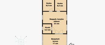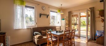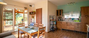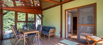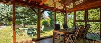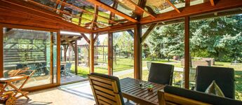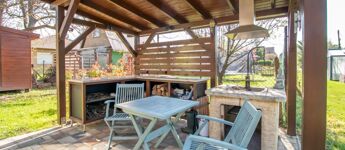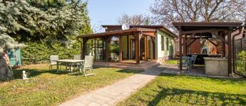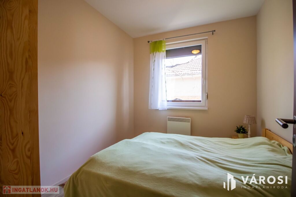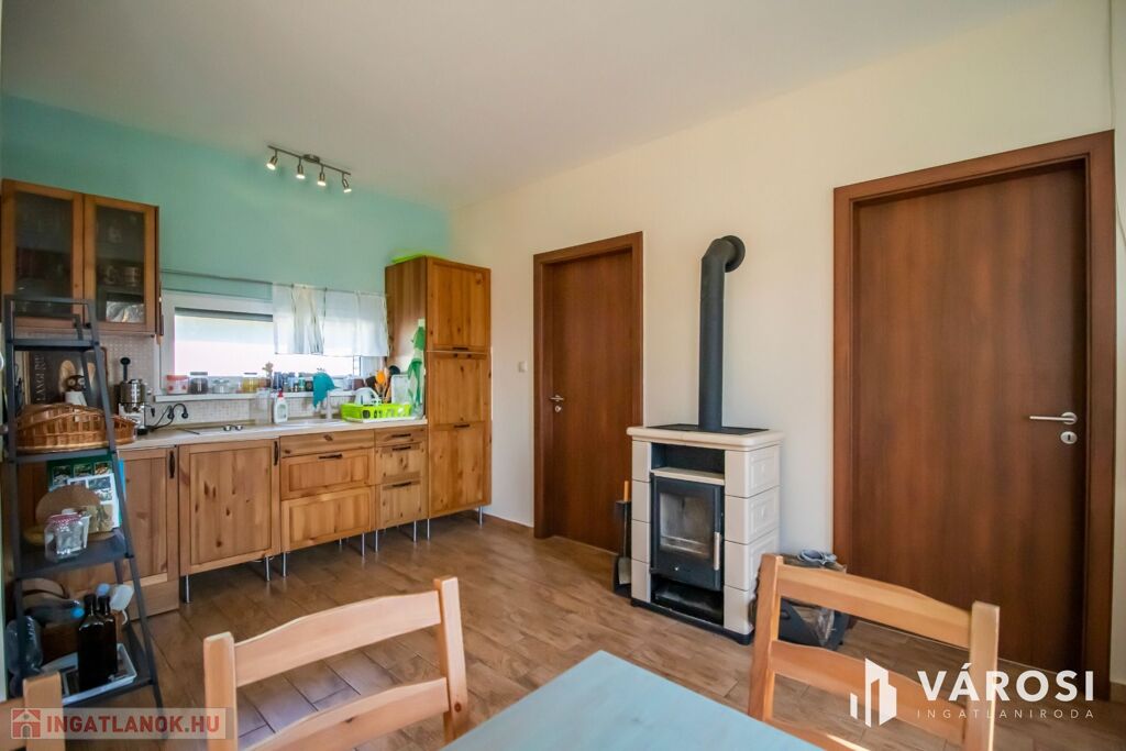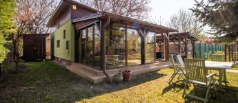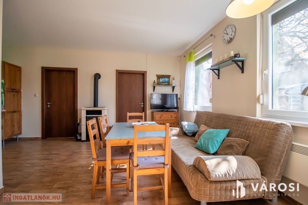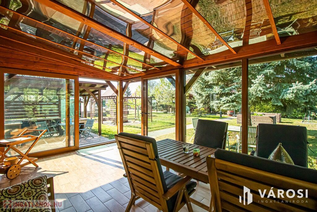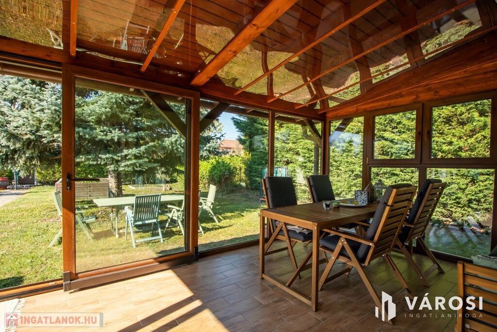 Az 577 négyzetméteres telken épült, 62 négyzetméteres tégla falazatú házban amerikai konyhás nappali étkezővel, 2 szoba és fürdőszoba található. A ház előtti terasz be lett építve, 3 rétegű üvegezéssel ellátott oldalfalakkal és hatalmas tolóajtóval. Ezeket kinyitva, közvetlen kapcsolat nyílik a csodás kerthez. Akár mind a 4 évszakban használható! Az életteret növeli a ház mellé épített szabadtéri konyha is. A ház igény szerint a teljes berendezéssel együtt eladó. A ház mellett további kettő kis tároló került megépítésre, a kerti eszközök tárolására.