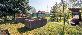 A házhoz tartozó kert és az 501 négyzetméteres másik telek is szépen parkosított. Magaságyások és üvegház biztosítják az itt lakók egész éves zöldségszükségletét. A locsolásról saját fúrt kút és kiépített öntözőrendszer gondoskodik. Becsült piaci értéke körülbelül 45-50 mFt.