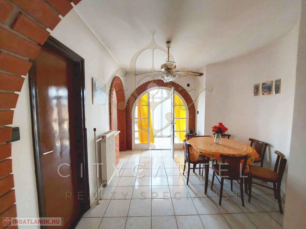 Kétszintes, felújításra szoruló családi házat kínálunk eladásra a barátságos alföldi kisváros csendes utcájában. A település központjától csupán néhány percnyire, elhelyezkedő ház az 1960-as években épült, ezt követően pedig 1993-ban részleges felújításon és bővítésen esett át. Az eredetileg 77 nm-es kockaházat újabb 72 nm-es lakótérrel bővítették, korszerűsítették a fűtésrendszert, felújították a víz- és elektromos vezetékeket. A tekintélyes méretű épület új tetőszerkezetet kapott, így a 94 nm-s padlástér újabb lakóhelyiségek kialakítására is lehetőséget kínál. A kiváló statikai állapotban lévő ház száraz, tégla falai 149 nm-es lakóteret zárnak közre, amelyen a tágas nappalihoz 2 db világos hálószoba, 2 db étkező, konyha, 2 db kamra, 2 db fürdő+WC, lakóelőtér, előszoba, közlekedő és télikert kapcsolódik. Az épület alatt elterülő 75 nm-es alagsor garázsnak, kazánháznak és tároló helyiségeknek ad helyet. A családi ház fűtéséről gáz-és vegyes tüzelésű kazánokkal üzemeltetett központ fűtésrendszer gondoskodik, de a régi és újabb épületszárnyak fűtése külön-külön, egymástól függetlenül is megoldható. A 2.469 nm-es gondozott udvar és kert, valamint a lakóház mögött álló gazdasági épületek akár gazdálkodásra, konyhakert kialakítására, esetleg baromfi nevelésére is alkalmas lehet.