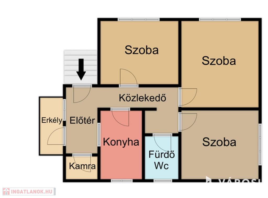 80nm – 3 szoba (20nm, 15nm, 14nm), konyha, fürdőszoba wc-vel, előszoba, közlekedő, erkély
