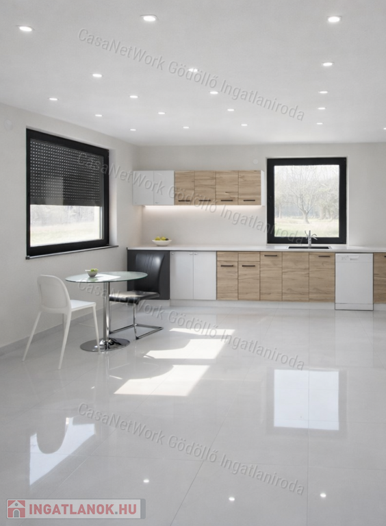 A nappalihoz kapcsolódik egy nagyméretű, modern konyha-étkező, amely ideális családi és baráti összejövetelekhez.