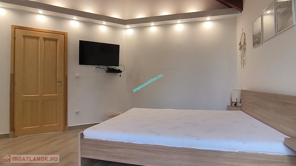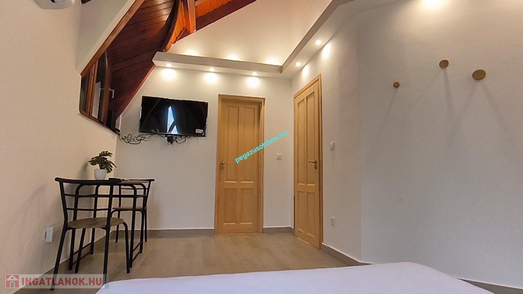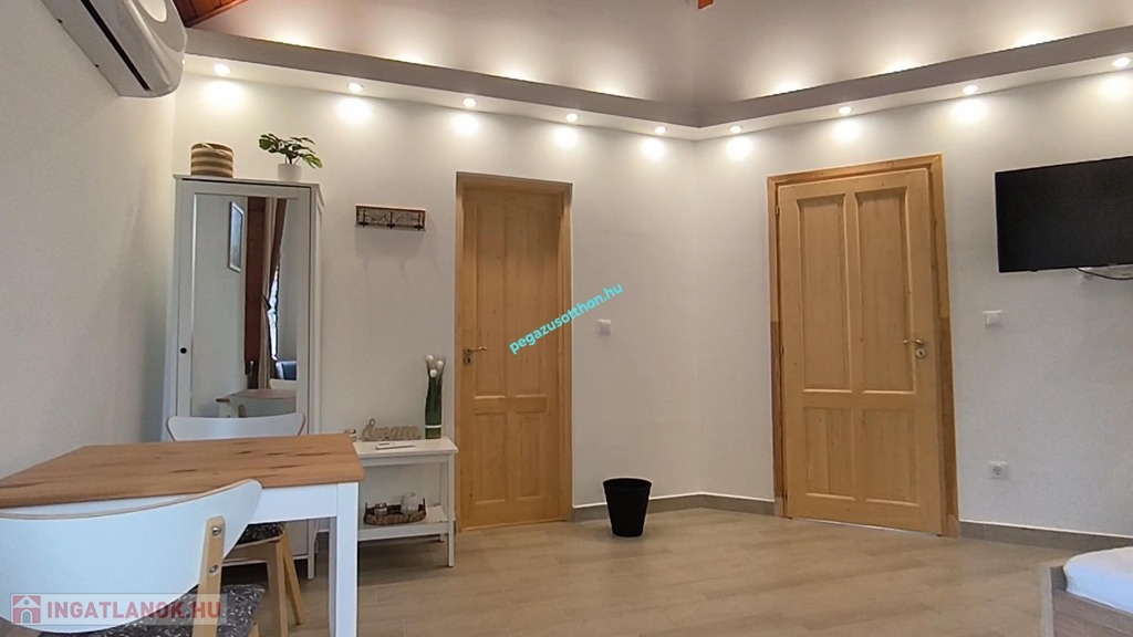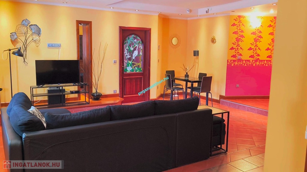 -Földszinti egysége külön apartmant alkot, nagyméretű nappalival, hálószobával, a fürdőszobában szaunával, és konyhával.