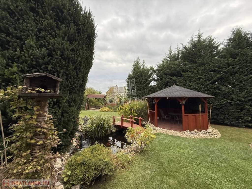 A kert öntözőrendszerrel ellátott, benne dísznövények, kis kerti tó és sütögető teszik hangulatossá a környezetet.