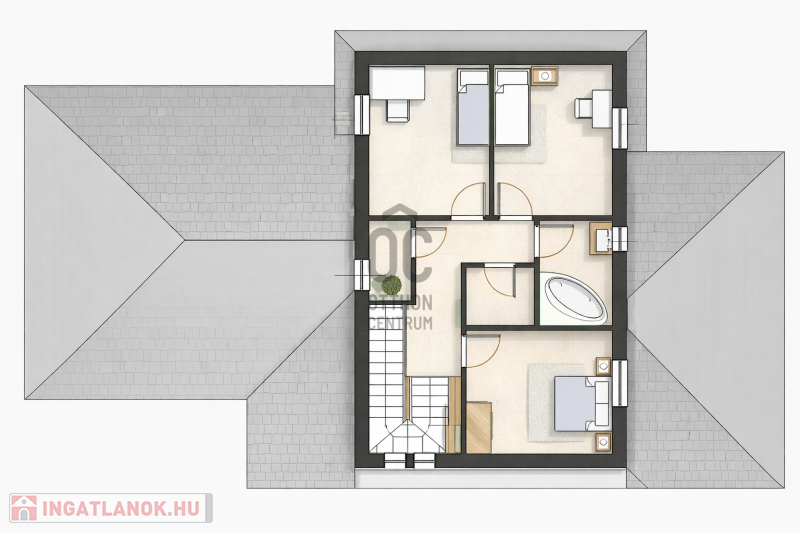 - Emelet: közlekedő, 3 különnyíló hálószoba, gardrób, fürdőszoba, külön WC.