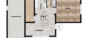 Földszint (47,4m2): előszoba, étkező és konyha egy légtérben helyezkedik el. Innen nyílik még egy szoba, egy fürdő-WC és lépcsőház, mely a szuterénbe vezet.