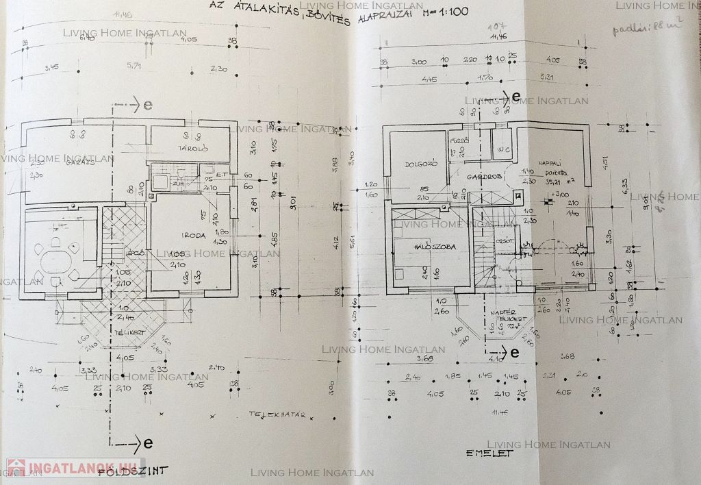Földszint: szoba, fürdőszoba, WC, előszoba, gépesített konyha/étkező, tároló, garázs, terasz.