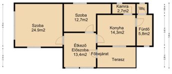 Belső lakrész helységei: 2 külön bejáratú szoba melyek közül, a kis szobához egy kis gardrób is tartozik, előtér-étkező közvetlen teraszkapcsolattal, külön fürdő, külön mellékhelyiség, konyha kamrakapcsolattal.