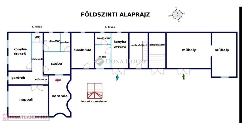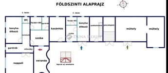 A földszint 110 m2-en tágas nappali, konyha-étkező, 1 szoba, 2 gardrób, fürdő+WC, külön WC, közlekedő, veranda elosztású.