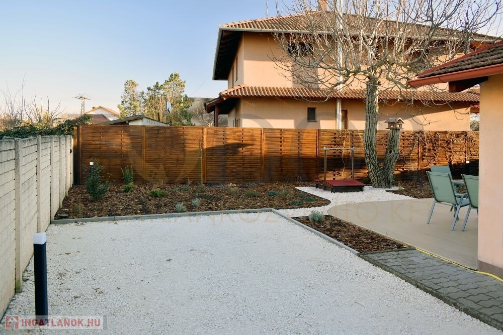 • 141 m²-es lakótér, 16 m²-es garázs elektromos kapuval, 180 m²-es gondozott, automata öntözésű díszkert, ahol válogatott növények és egy gyönyörű diófa adnak árnyat a nyári napokon.
