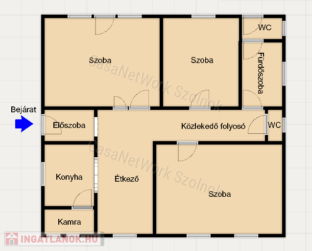 - a következő helyiségek kerültek kialakításra : a földszinten előszoba, konyha, étkező, fürdőszoba, közlekedő folyosó, 2 külön illemhelyiség , 3 szoba