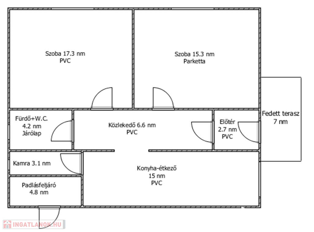 Helyiségei: előtér, közlekedő, 2 szoba, konyha, kamra, fürdőszoba+W.C., fedett terasz és egy kívülről megközelíthető padlásfeljáró/tároló.